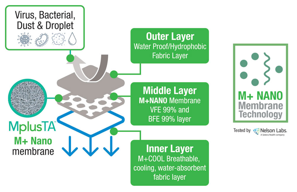 - 4 LAYERS – The outer layer is hydrophobic fabric layer; the middle layer was formed by 2 layer of VFE 99% & BFE 99% M+NANO membranes, it provide maximum protection; the last layer is M+COOL fabric layer.