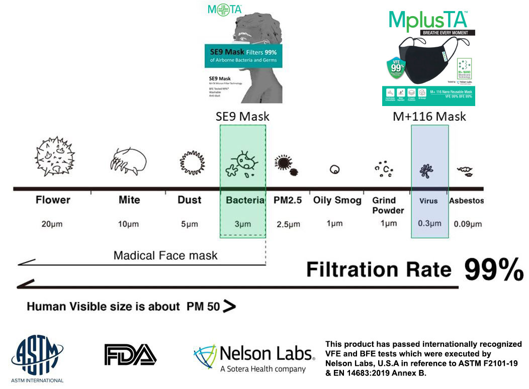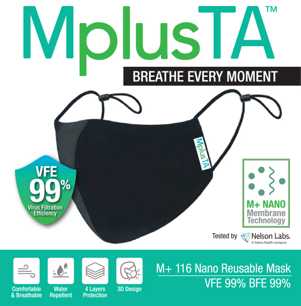 M+116 Nano Mask consist of 4 layer of excellent material to provide excellent protection against airborne viruses. The outer layer is hydrophobic fabric layer which shield off any potential droplet from human to human contact; the middle layer was formed by 2 layer of VFE 99% & BFE 99% M+NANO membranes, it provide maximum protection; the last layer is M+COOL fabric layer, special material make you breathable and feel cooling whole day!